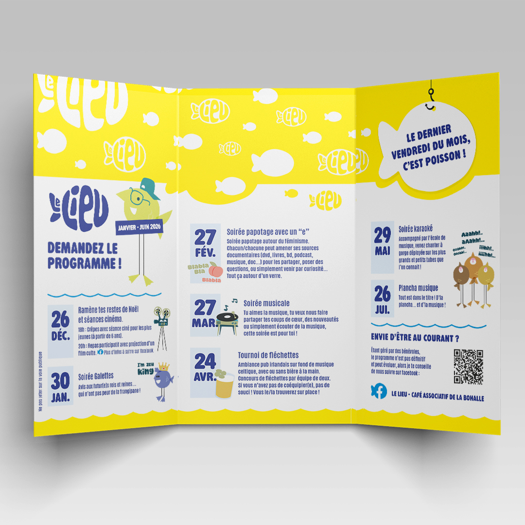 Refonte de l'identité graphique d'un lieu/bar associatif ouvert aux habitants de la Bohalle, village ligériens proche d'Angers. Le but est de suggérer de la diversité (culturelle, générationnelle) à travers les perso/poissons. Rassembler autour d'un lieu et favoriser la rencontre entre habitants. Utilisation de codes ludiques proche des Shadoks, Burger Quizz... avec une ligne éditoriale autour du vocabulaire fluvial (poisson, Loire, courant, eau…). Tant graphiquement que éditorialement, le ton est donné, il ne reste plus qu'a le faire vivre.