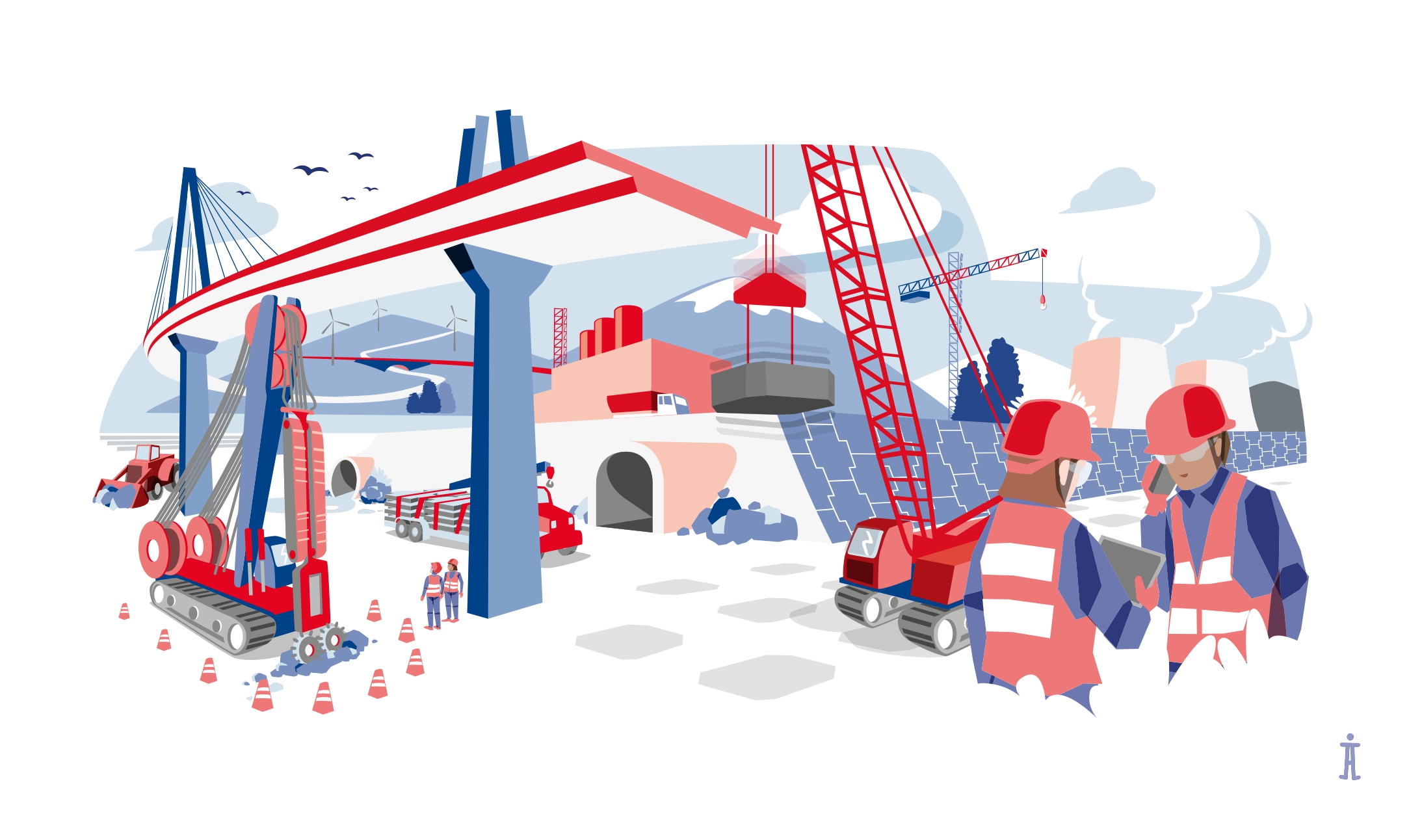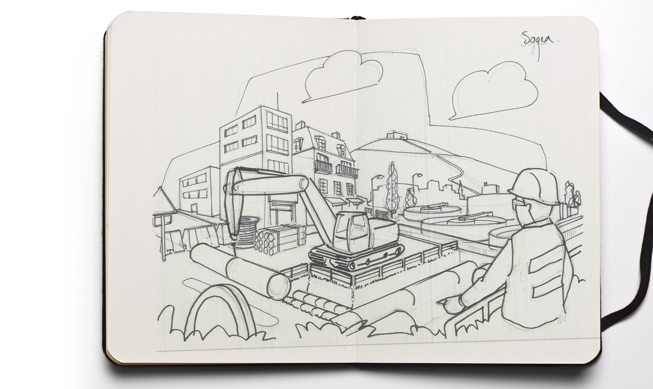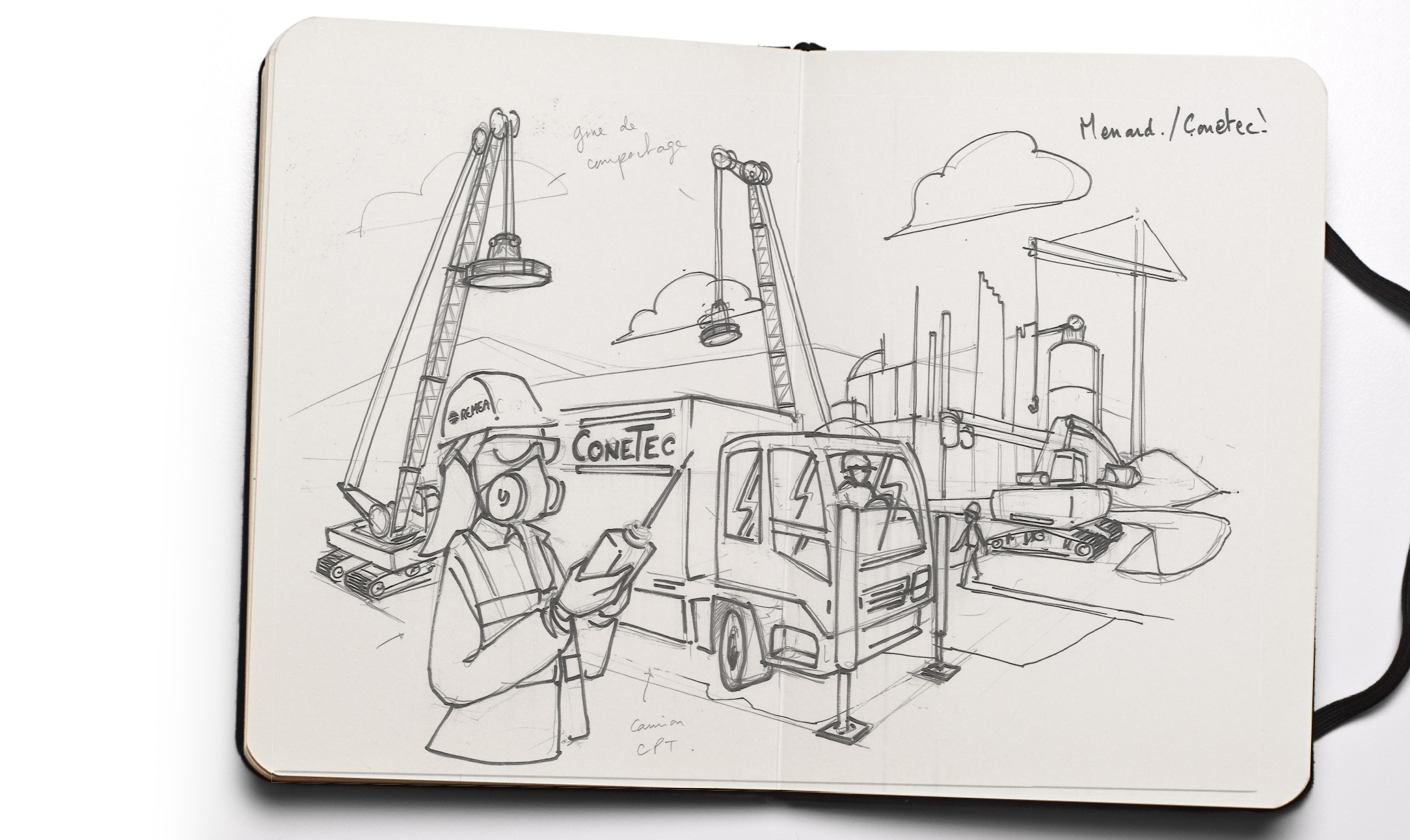 Illustrer chaque domaine, chaque filiale en respectant toutes les contraintes associées à l'activité (sécurité, normes, réglementation...). A chaque illustration, un croquis d'intention a été réalisé pour valider les éléments et leurs positionnements.